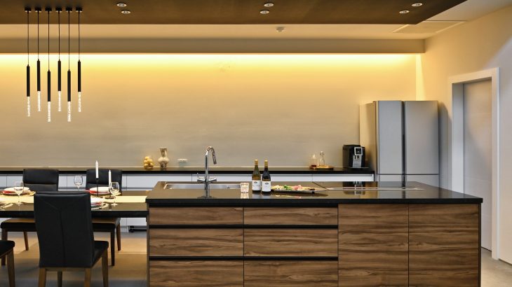 木目が美しいオーダーキッチンの実例です。 天板はマットブラックのクォーツストーン。昇降式ダウンドラフトフードとIHでフラットを実現。 天井からのレンジフードがなくダウンライトや間接照明ですっきりとしたモダンな雰囲気のキッチンスペースです。