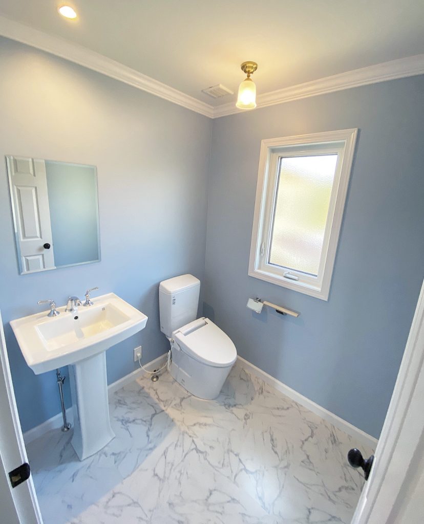 ブルーのドライウォールの壁とホワイトのモールディングやフロアのコーディネートが清潔感もあり爽やかな印象です☺︎